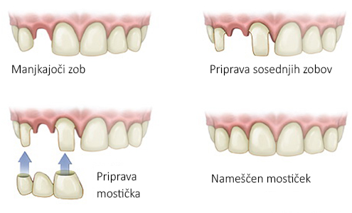 PREVLEKA oz. KRONA Kadar je zoba premalo, da bi lahko naredili ustrezne plombe ali inlaye/onlaye, je potrebno narediti prevleko oz. krono. Poznamo več vrst prevlek, izbira je odvisna od materiala in stopnje estetskega učinka, ki ga zahtevamo. Kovinsko keramične prevleke so dokaj kakovostnejša rešitev. Na jekleno ogrodje se okrog zoba nanese keramika, tako da je zob “cel bel”. Cirkonij keramične prevleke: na cirkonijevo ogrodje, ki je tudi bele barve, se nanese keramika, tako da se izognemo temnemu robu pri dlesni. Polno keramične prevleke so najbolj estetske in dajo videz naravnega zoba. Cirkonij keramične in polno keramične prevleke izdelajo v tehniki s CAD-CAM tehnologijo (računalniška obdelava odtisa) za popolno nalaganje prevlek. MOSTIČKI Kadar manjka cel zob se lahko vrzel zapre tako, da naredimo mostiček. Sosednja zoba obrusimo in nanju nataknemo mostiček. Kadar sosednjih zob ne želimo brusiti, se odločimo za implantat.